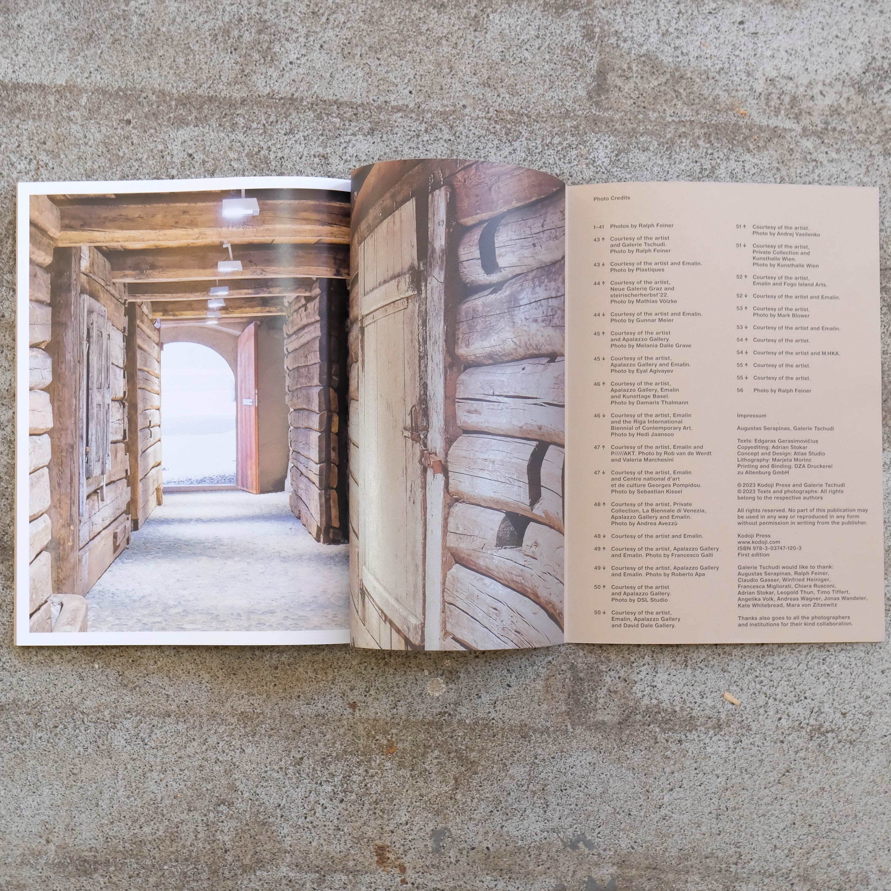 『Space Can…』は、2023年にエンガディン地方ズオズのギャラリー・チュディで開催されたアウグスタス・セラピナスの冬季展覧会の入り口と出口で始まり、終わります。セラピナスの展覧会は、中世のチェサ地区の空間を、異なるヴァキュラーの建物で満たしました。屋根板が石壁を覆い、Aフレームの屋根全体がギャラリーの一つを占め、巨大な交差梁で構成された構造物が、建物の最も高い空間で建物の梁と交差するようにそびえ立っていました。破壊される運命にあったリトアニアの建物から発見された要素は、芸術の文脈において彫刻、あるいは少なくとも建築的ではない何かとなりました。装飾的でありながら機能的なシャッターはレリーフ作品となり、陶器の窯はまるで空っぽの台座のようにぽつんと立っていました。セラピナスが本展で取り上げた建物は、消えつつある田舎風の建物で、ほとんど時代遅れになっています。スイスの建物では、使用されている木材や工芸技法がそれぞれ異なります。ある建物が丁寧に修復され、他の建物が解体されるのは、ほんの偶然に過ぎません。しかし、リトアニアの建物の部材をスイスのギャラリーに移設し、再構成することで、アーティストはそれらの建物に予期せぬ意味を伝えています。