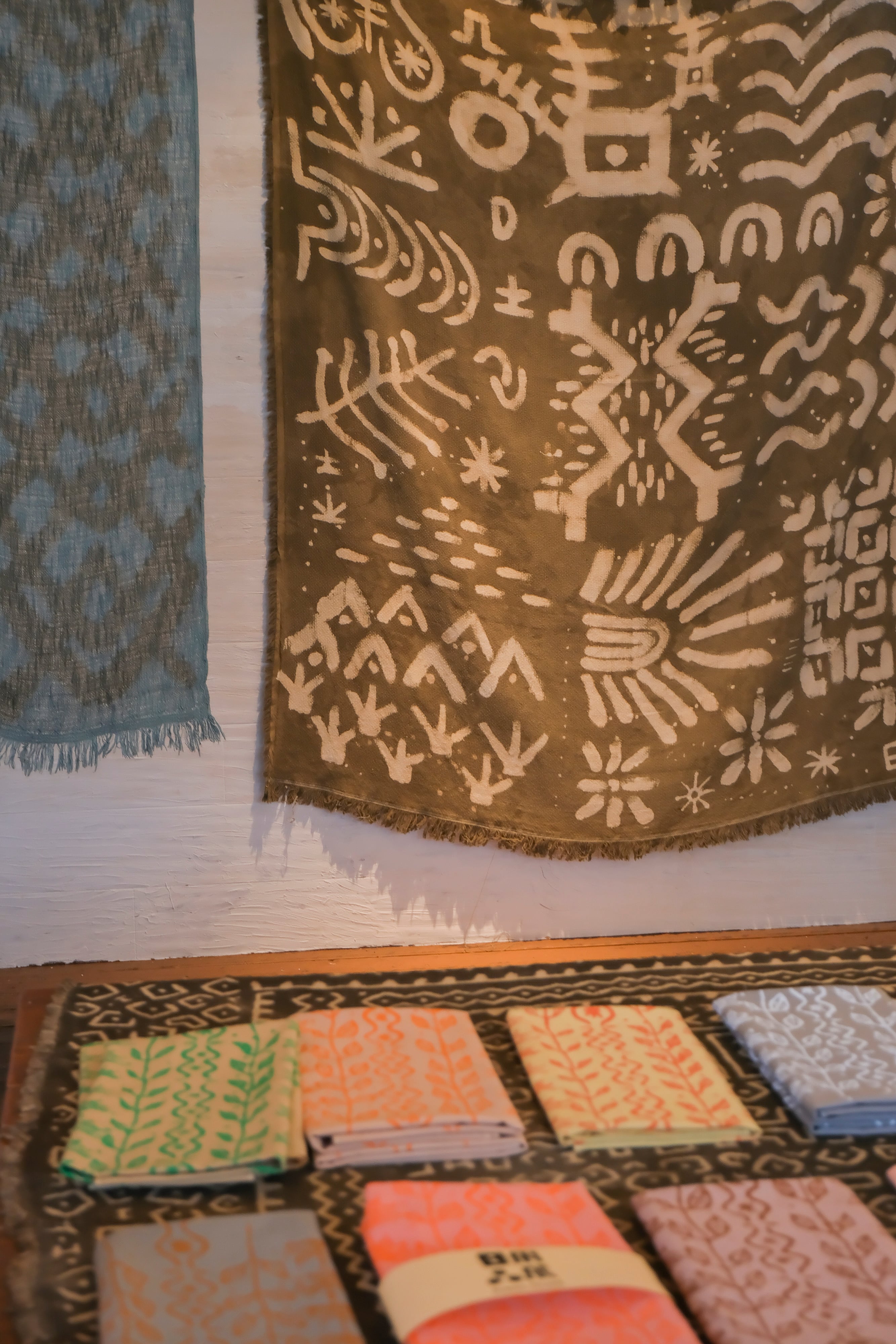 ペインター・カネダタイコウと染師・コダマによるコラボプロジェクト「日用品展」に合わせて製作された。コダマが草木染めを施した布にタイコウが脱色剤で筆をいれた一点物ファブリックです。