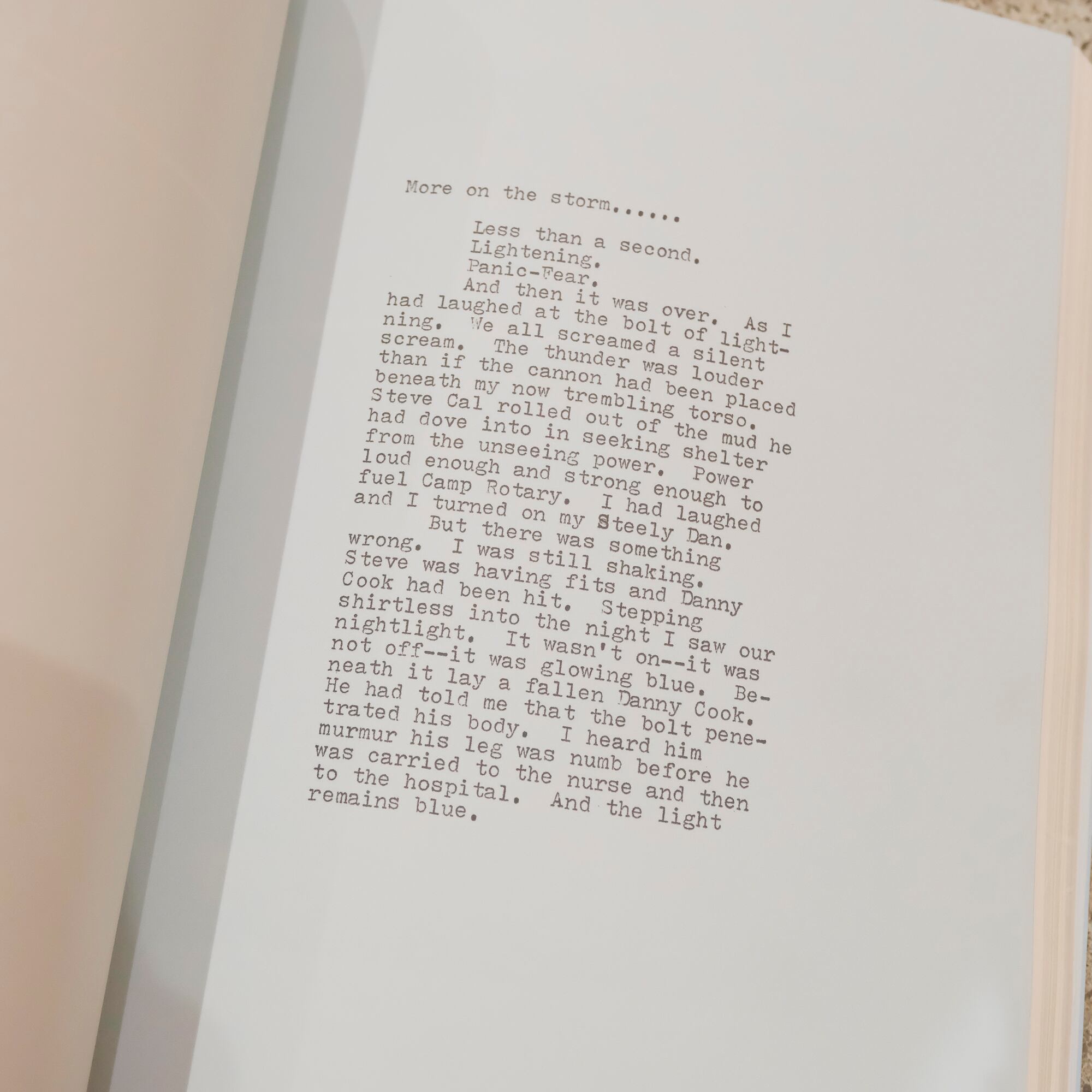 「みんなが私たちをあざけるだろうことはわかっている。私が見たものについてそうだったように。あの恐ろしい悲劇に笑った。でも、あの出来事が私たちを襲ったのだとわかっている。大地を震わせる音と、目もくらむような、青白いエネルギーの無秩序な雷は本物だった。私たちは事実として知っている。ダニーも知っている。神があの雷を放つとか、運命は人をからかうのが好きだと言う人もいる。15ヤード以内のあの雷は、私の目が見えなくなった顔にニヤリと笑ったので、運命がすべてを支配していることを思い出させた。運命は私たちを笑った。そして今、私たちは恐怖を知った。でも、私たちは笑っていない。電気はついているのに電気が消えたから笑っているのではない。」