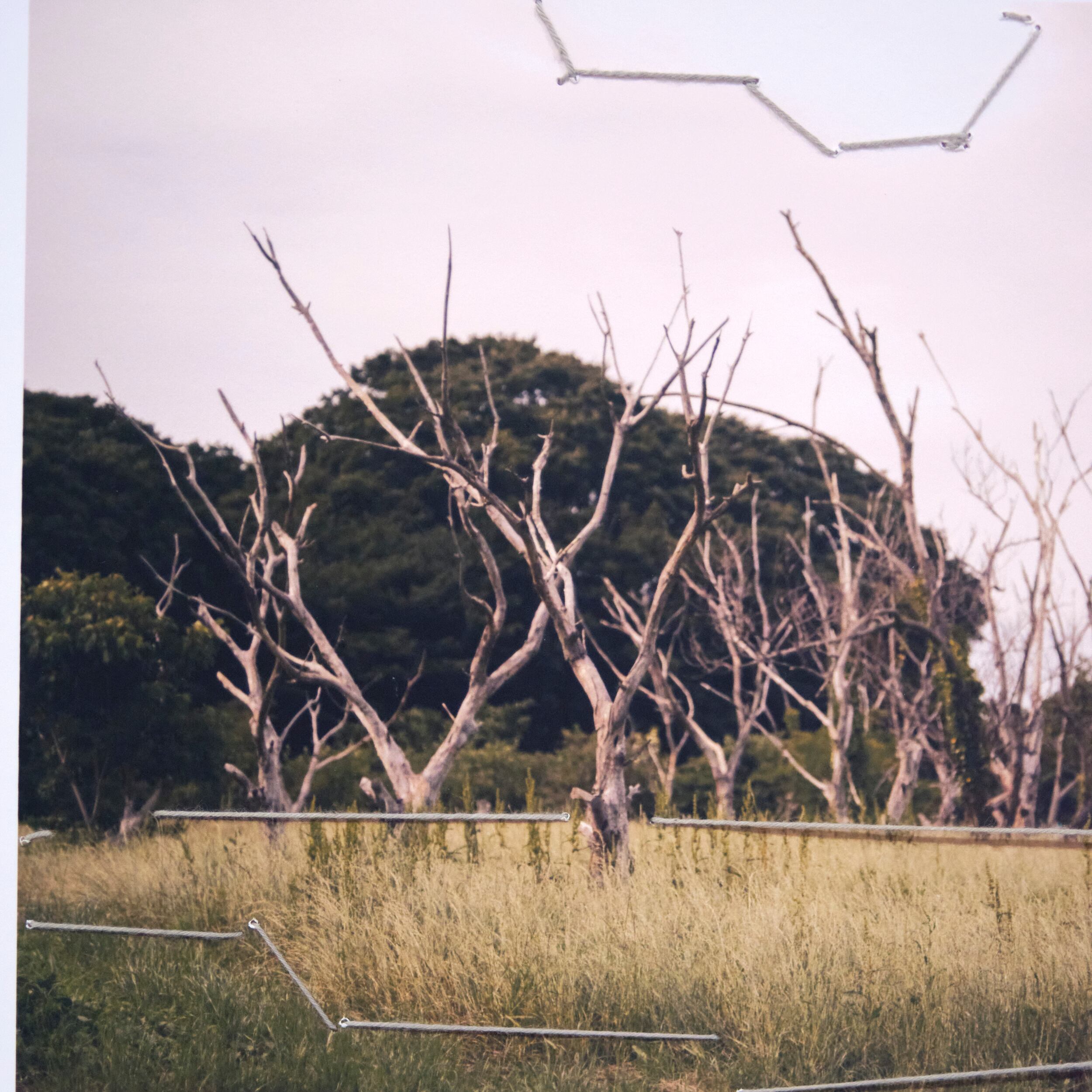 マット紙に写真をプリントし、その上から草木染めをした、さしこ糸を直接手縫いした作品。