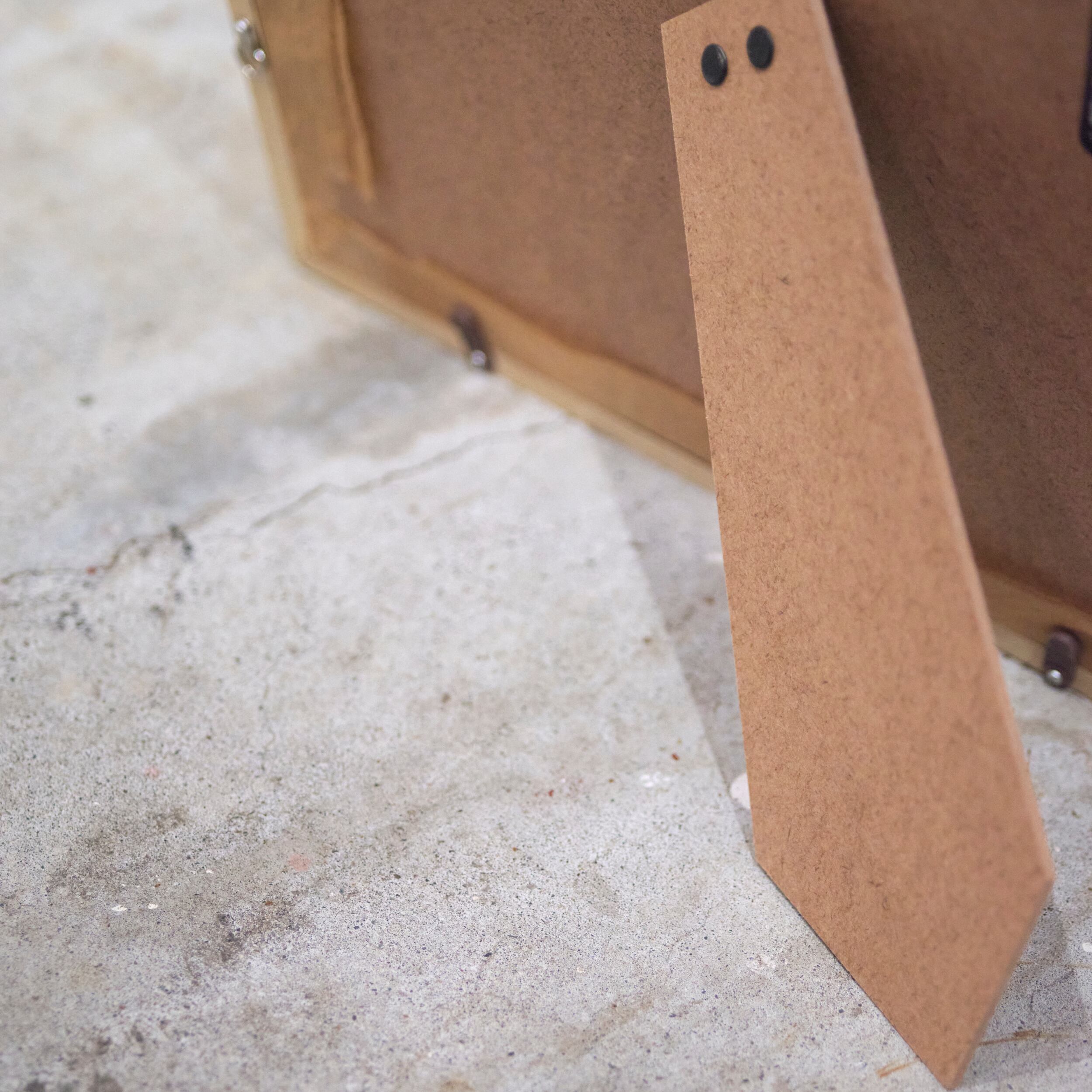 額装したものを直接お渡しします。裏はスタンド付きの額になっています。額は4つ切りサイズになっております。
