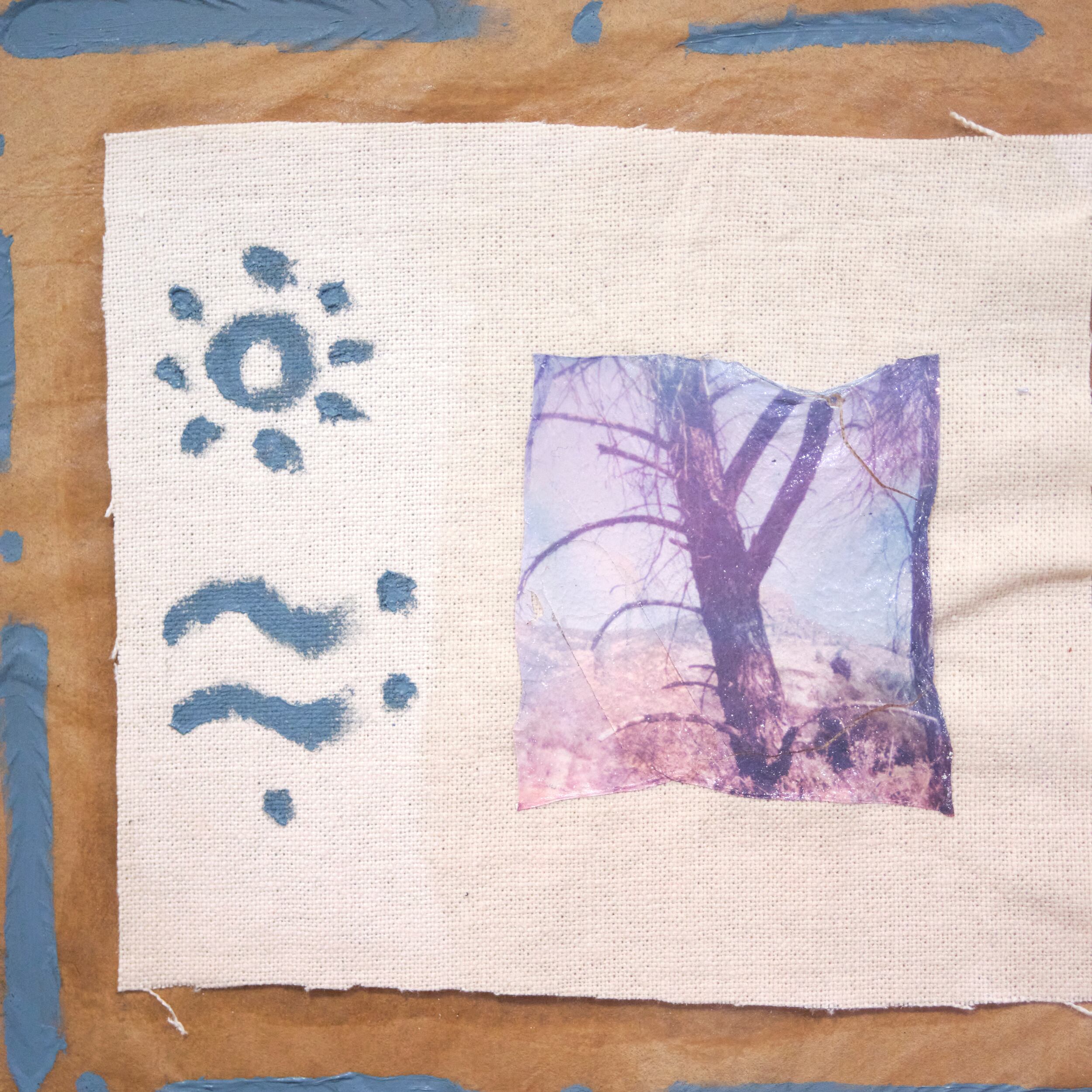 エマルジョンリフトという技法を用いて、木霊の草木染の布にポラロイドフィルムを転写しています。キャンバスにクラフト紙を覆いカバーにし、その上にフィルムを転写した布を貼り付けて、ドローイングを布とマットに施しています。完全複製不可能オリジナルの一点もののフォークアート。