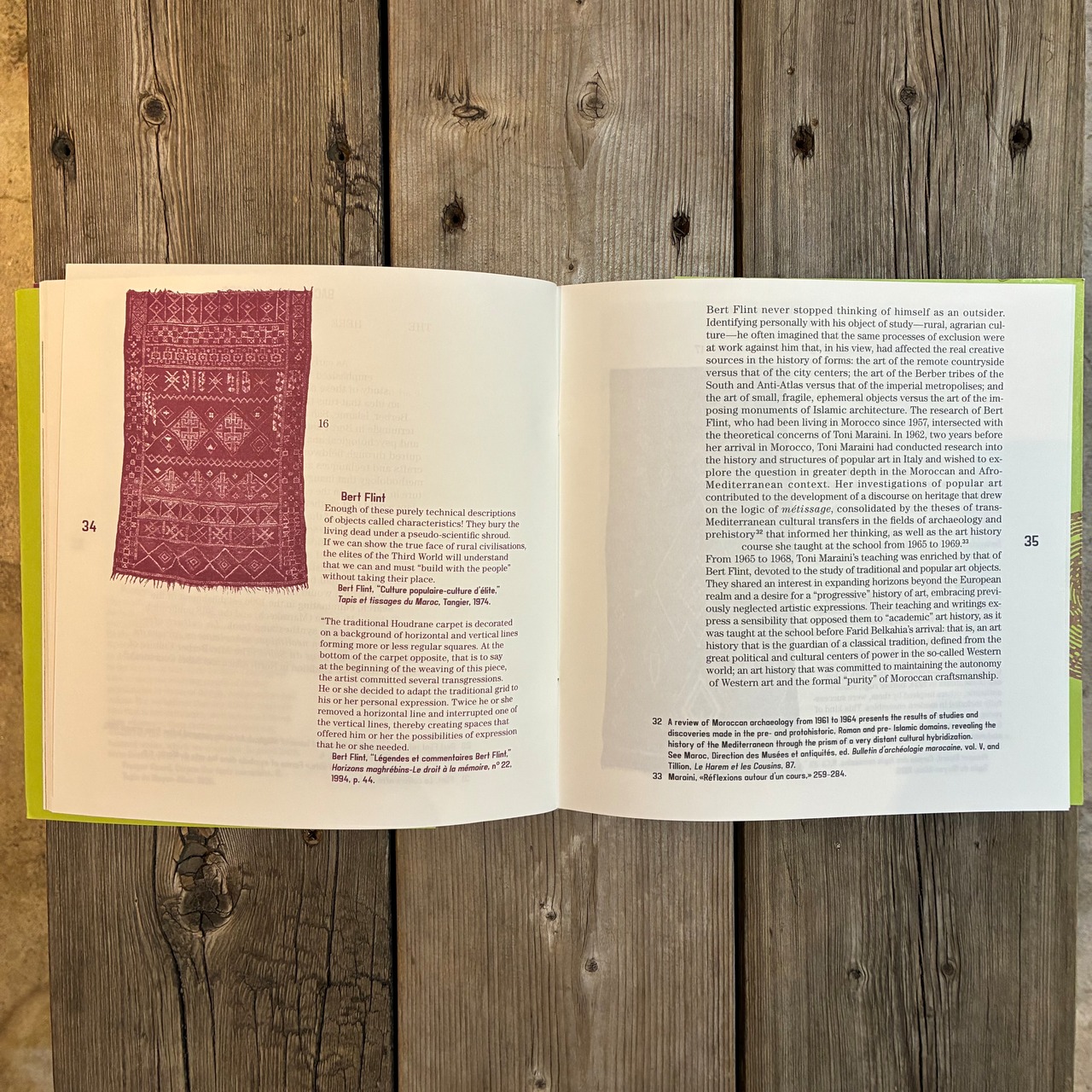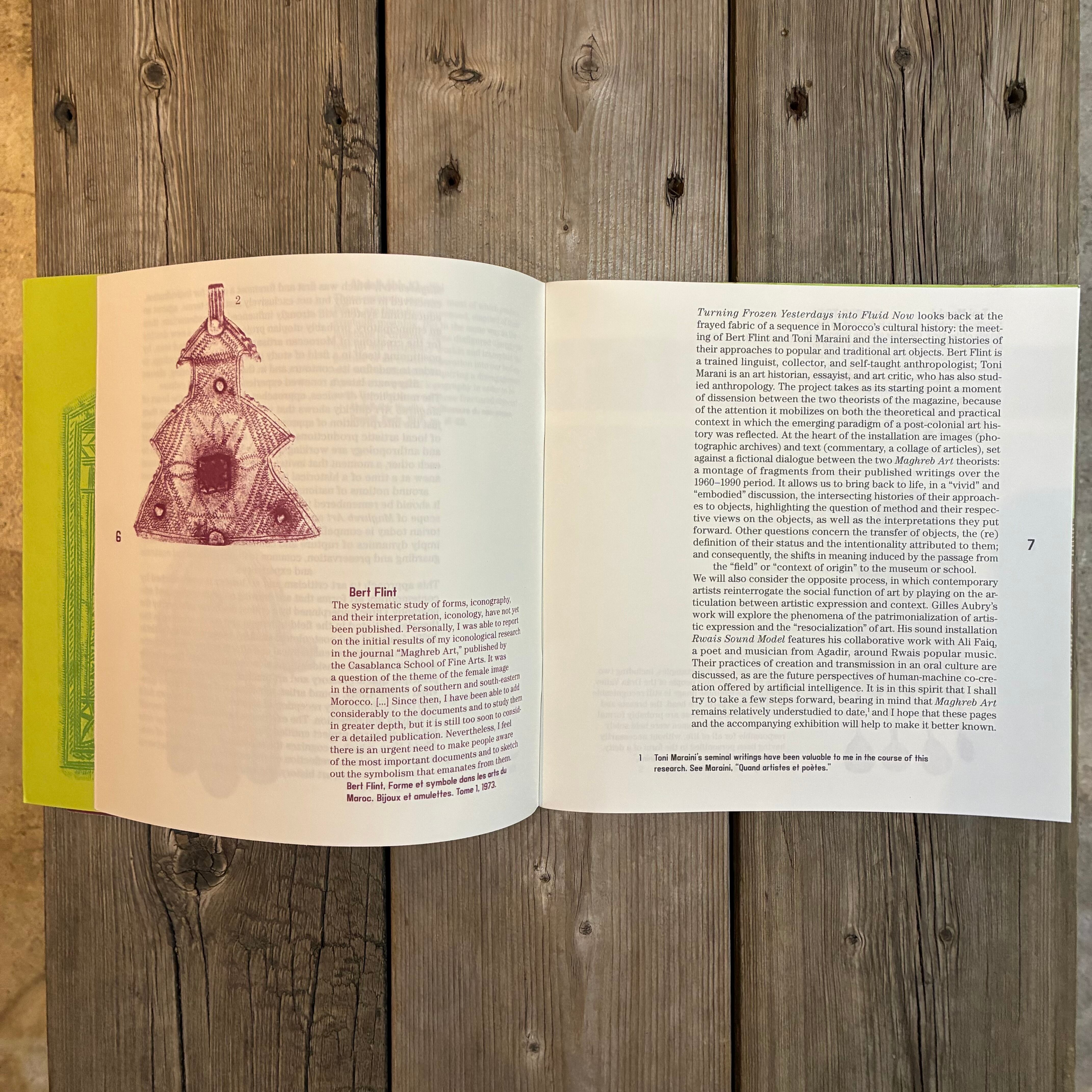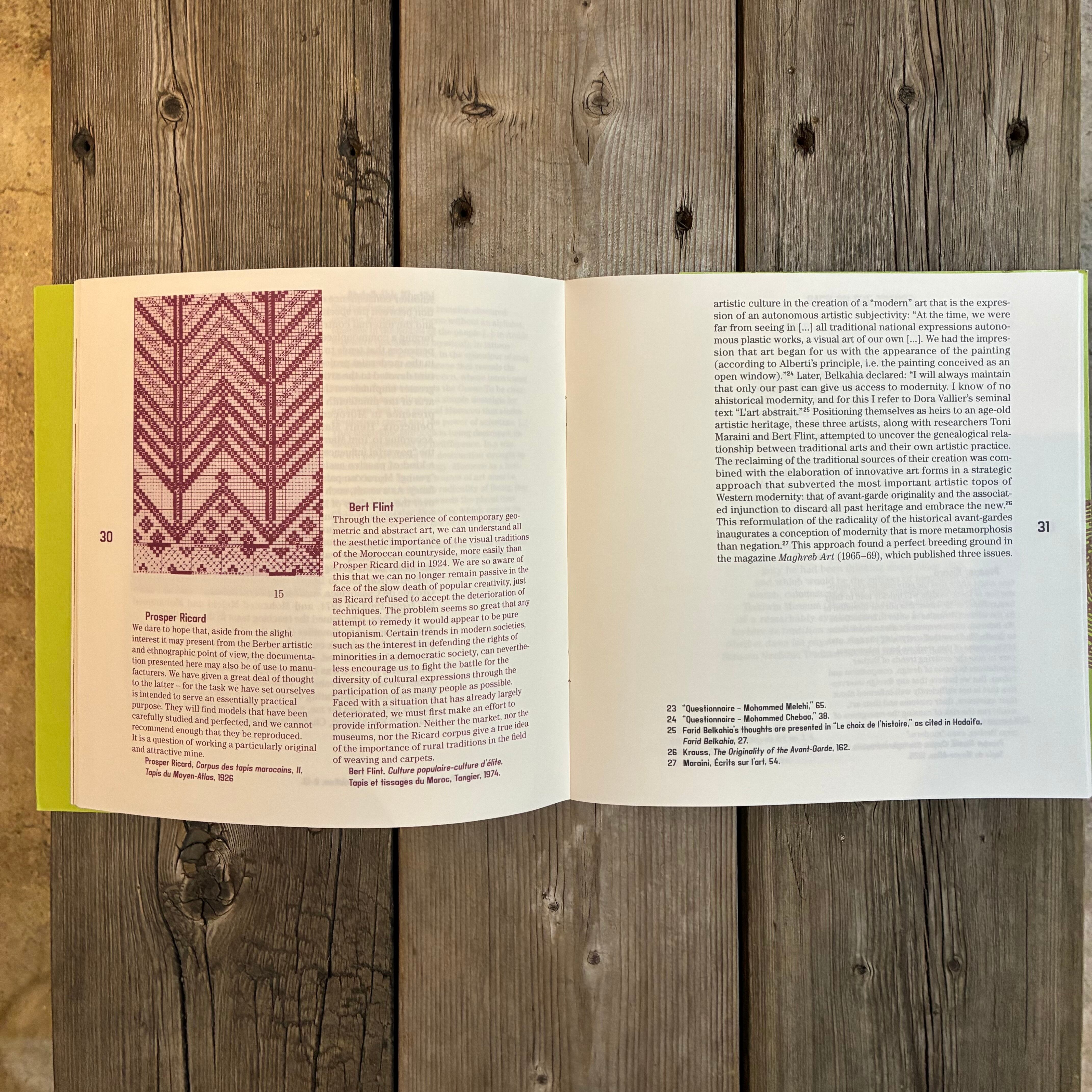 二人の人類学者の出会いと、彼らの民衆芸術および伝統的な工芸品へのアプローチが交差する歴史ーを再考するものである。本エッセイは、キュレーターであるファティマ=ザハラ・ラクリッサによって開催された同名の展覧会(キュラトリアル・プロジェクト「School of Casablanca」〔カサブラン力:2024年11月11日~12月31日/ベルリンのifa ギャラリー:2024年2月16日~5月12日〕)に付随するもので、KWインスティテュート・フォー・コンテンポラリー・アート(ベルリン)およびシャルジャ・アート・ファンデーション(シャルジャ)が、ThinkArt(カサブランカ)、Zaman Books & Curating (パリ)、ゲーテ・インスティトゥート・モロッコと協働して立ち上げた。このエッセイおよび併設の展覧会は、カサブランカ美術学校によって刊行された隔年誌 Maghreb Art(編集は、アーテイストのファリド・ベルカヒア〔1934-2014〕、イタリア人美術史家のトニ・マライーニ〔1941-〕、オランダ人類学者のベルト・フリント[1931-2024]、そしてアーティストでありアートディレクターでもあったモハメド・ムレヒ〔1936-2020))の現代的な受容に焦点を当てている。同誌は、3号のみ刊行された美術学校のジャーナルである。