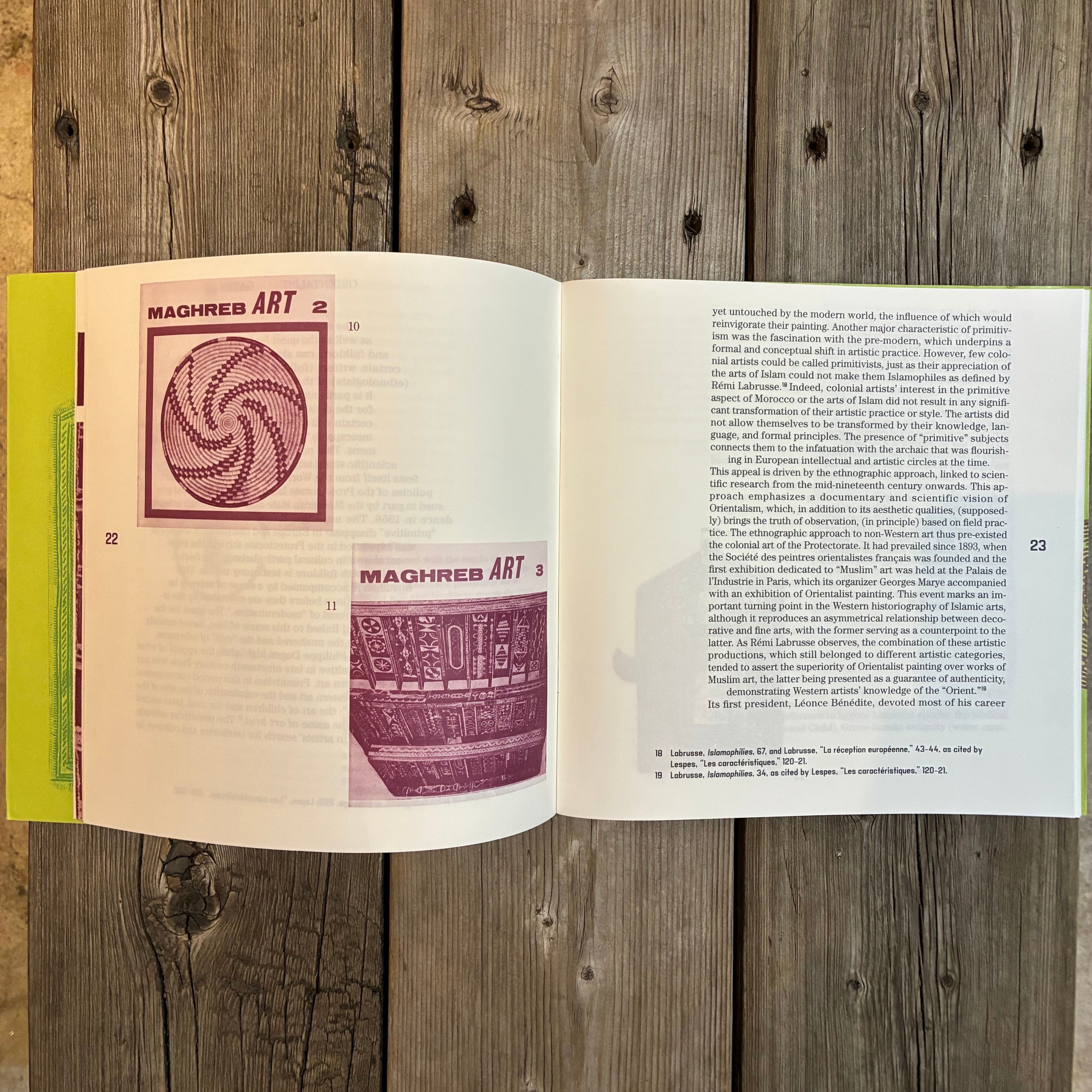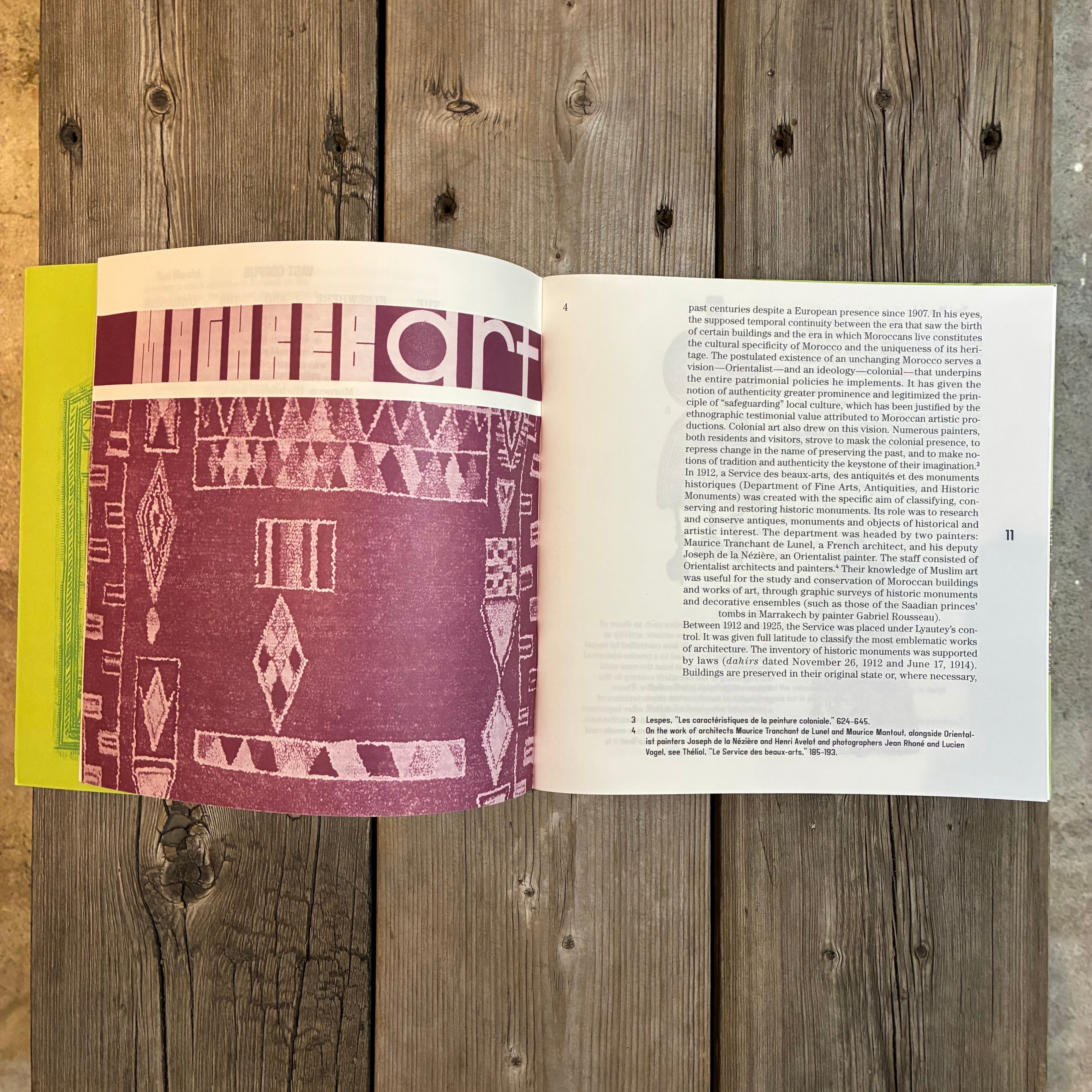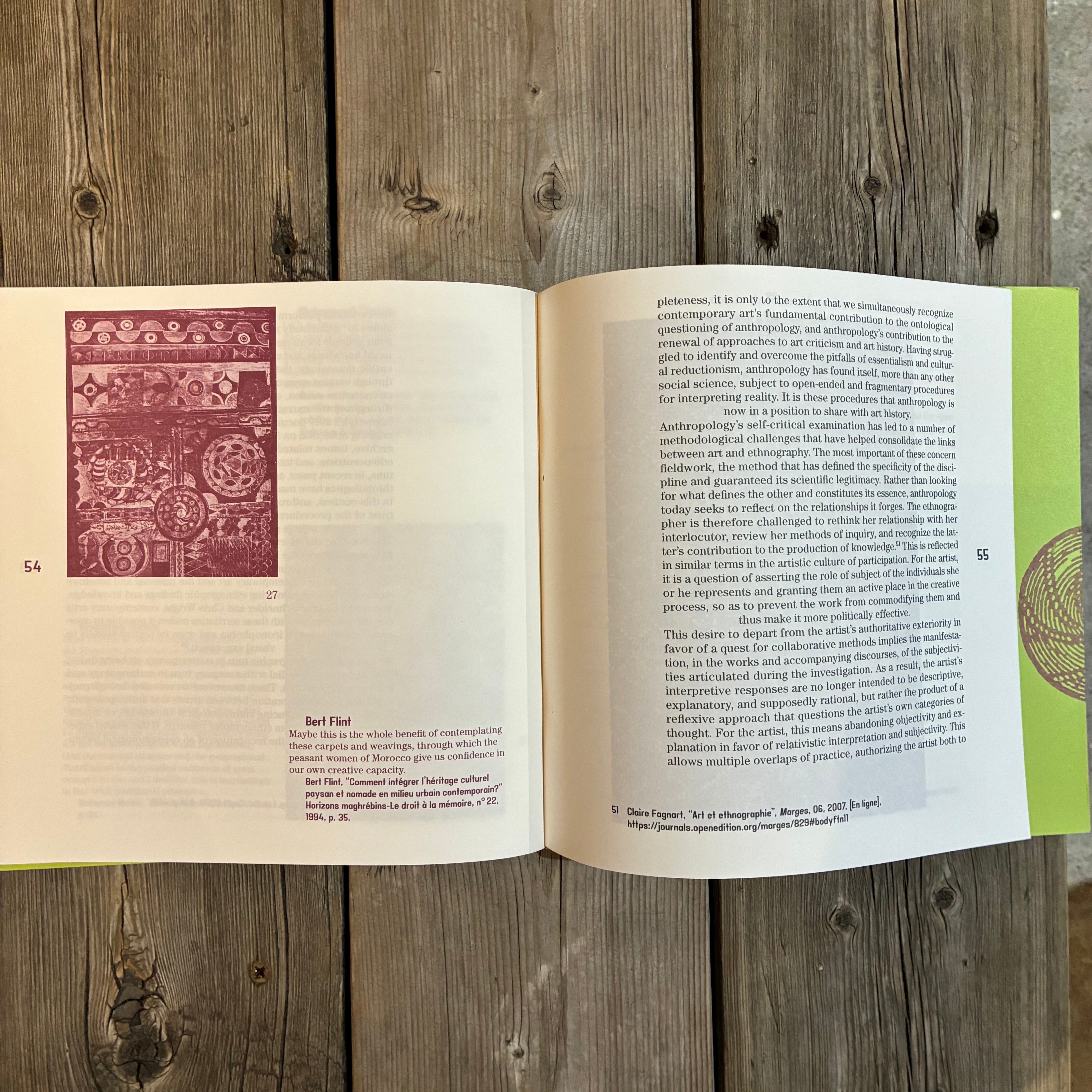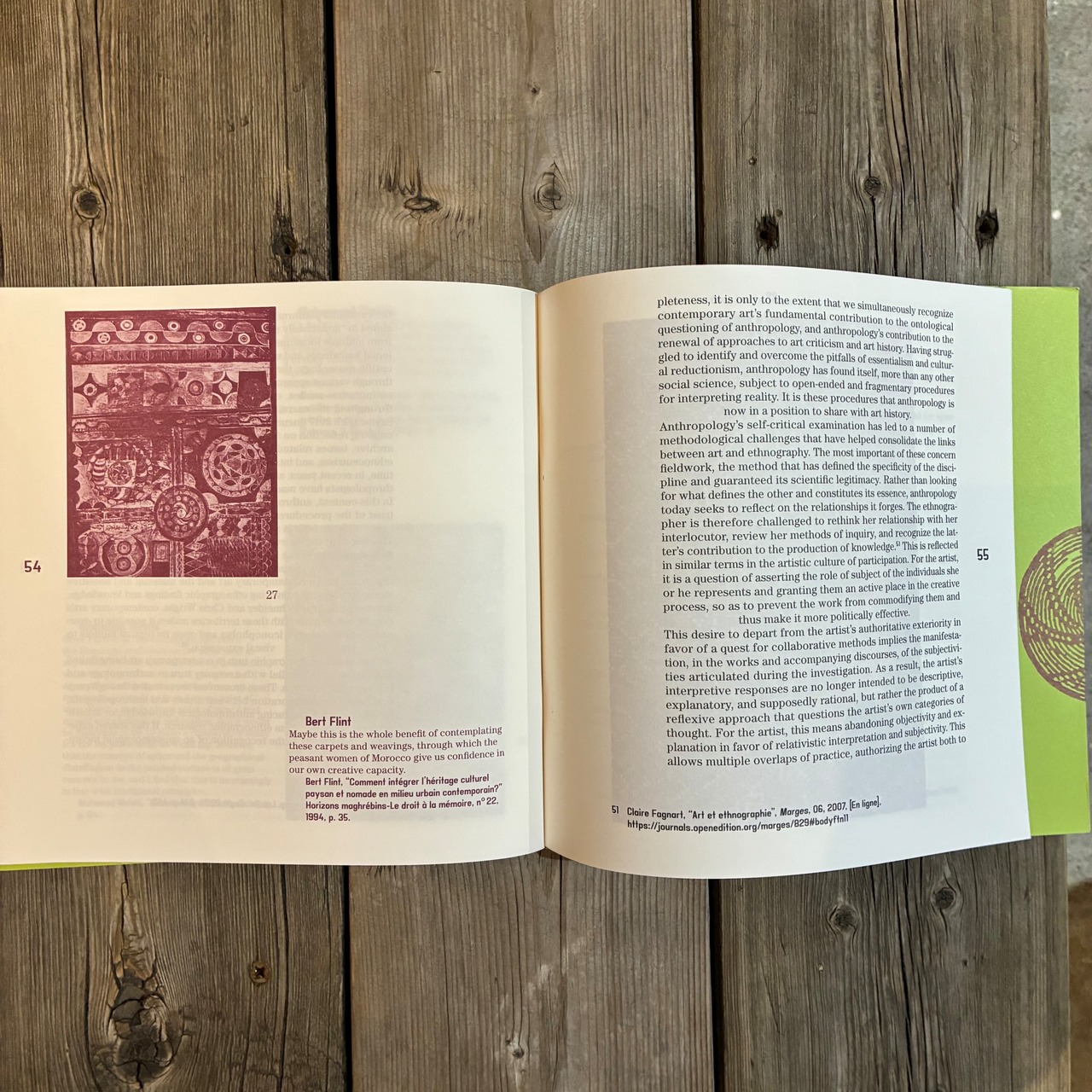 二人の人類学者の出会いと、彼らの民衆芸術および伝統的な工芸品へのアプローチが交差する歴史ーを再考するものである。本エッセイは、キュレーターであるファティマ=ザハラ・ラクリッサによって開催された同名の展覧会(キュラトリアル・プロジェクト「School of Casablanca」〔カサブラン力:2024年11月11日~12月31日/ベルリンのifa ギャラリー:2024年2月16日~5月12日〕)に付随するもので、KWインスティテュート・フォー・コンテンポラリー・アート(ベルリン)およびシャルジャ・アート・ファンデーション(シャルジャ)が、ThinkArt(カサブランカ)、Zaman Books & Curating (パリ)、ゲーテ・インスティトゥート・モロッコと協働して立ち上げた。このエッセイおよび併設の展覧会は、カサブランカ美術学校によって刊行された隔年誌 Maghreb Art(編集は、アーテイストのファリド・ベルカヒア〔1934-2014〕、イタリア人美術史家のトニ・マライーニ〔1941-〕、オランダ人類学者のベルト・フリント[1931-2024]、そしてアーティストでありアートディレクターでもあったモハメド・ムレヒ〔1936-2020))の現代的な受容に焦点を当てている。同誌は、3号のみ刊行された美術学校のジャーナルである。