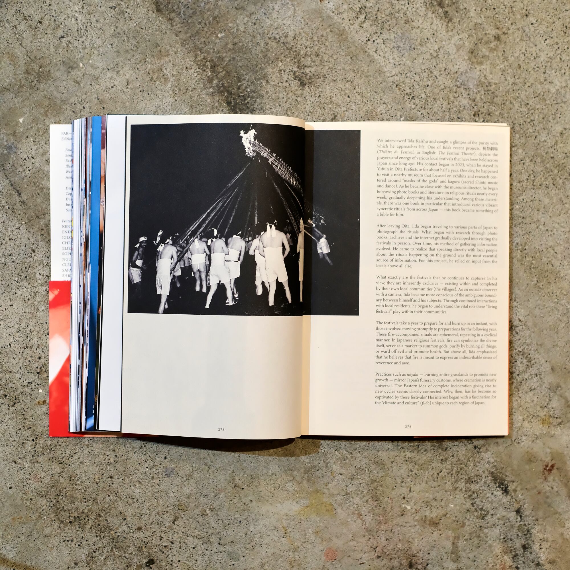 本号には、Kaishu Iidaよる《祝祭劇場》シリーズも収録。演劇的かつ儀礼性を帯びたイメージ群が、「HEAT」というテーマを個人的な身体感覚から集団的な祝祭空間へと拡張します。静かな親密さと、張り詰めた空気、そして祝祭の高揚。その振幅が一冊の中で有機的に展開されます。インタビューはTaikou Kaneda (Bong Sadhu).